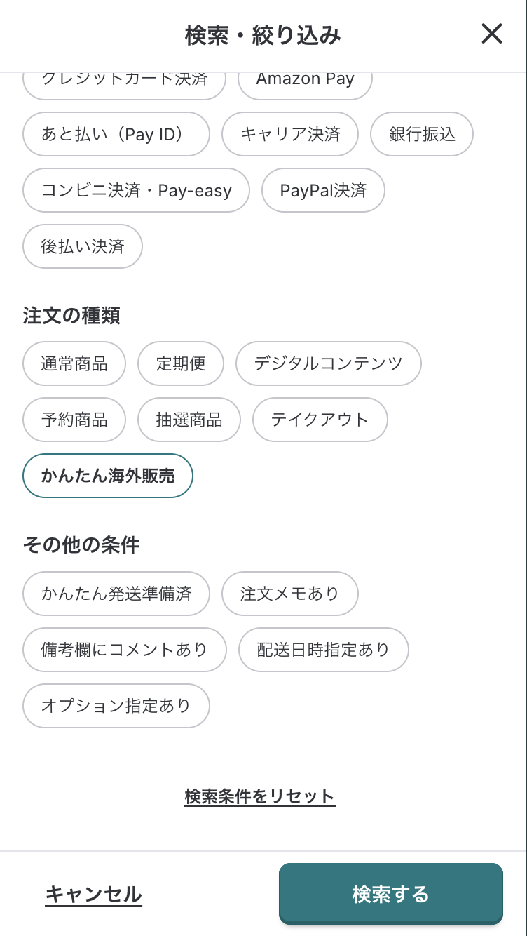 「かんたん海外販売」経由の注文のみを表示するには、以下の手順でおこなってください。